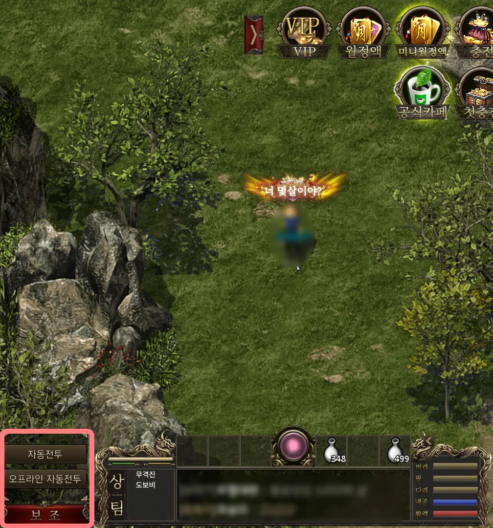 저동전투 설정에서 무공과 옵션을 설정해두면 자동으로 사냥 또는 수련을 할수 있는 시스템이다.