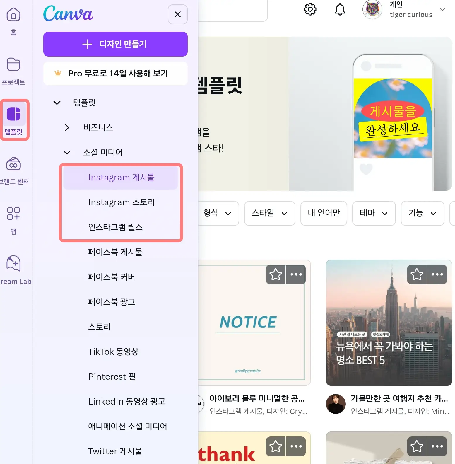 캔바는 블로그 썸네일부터 소셜 미디어 게시물, 프레젠테이션까지 다양한 템플릿을 제공합니다.