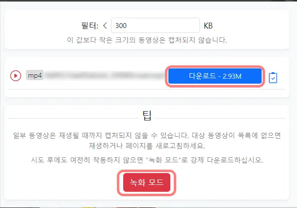비디오 URL을 감지하지 못하는 경우, 녹화 모드를 활성화하여 동영상을 재생하면서 녹화할 수 있습니다.