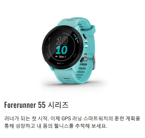 Forerunner 55(포러너 55)는 기본적인 러닝 기능을 제공하며, 가벼운 무게와 합리적인 가격으로 러닝을 시작하는 분들께 적합합니다.