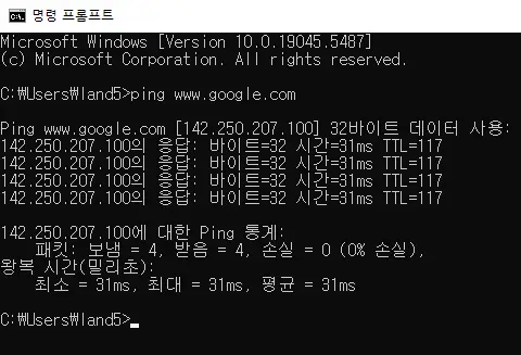 특정 서버와의 응답 속도를 확인하려면 ping www.google.com 명령어를 실행합니다.