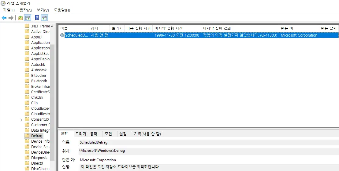 - 좌측에서 “작업 스케줄러 라이브러리” > “Microsoft” > “Windows” > “Defrag” 로 이동합니다.