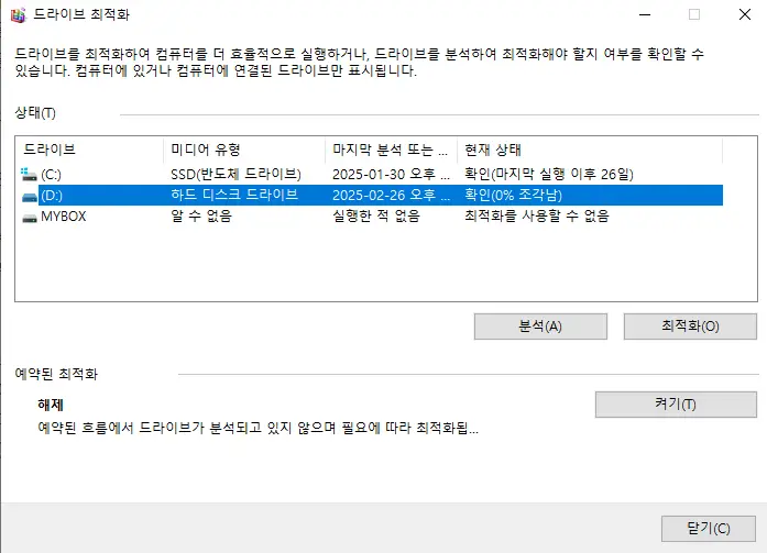 - HDD 사용자는 1~2달에 한 번 수동 조각모음 추천