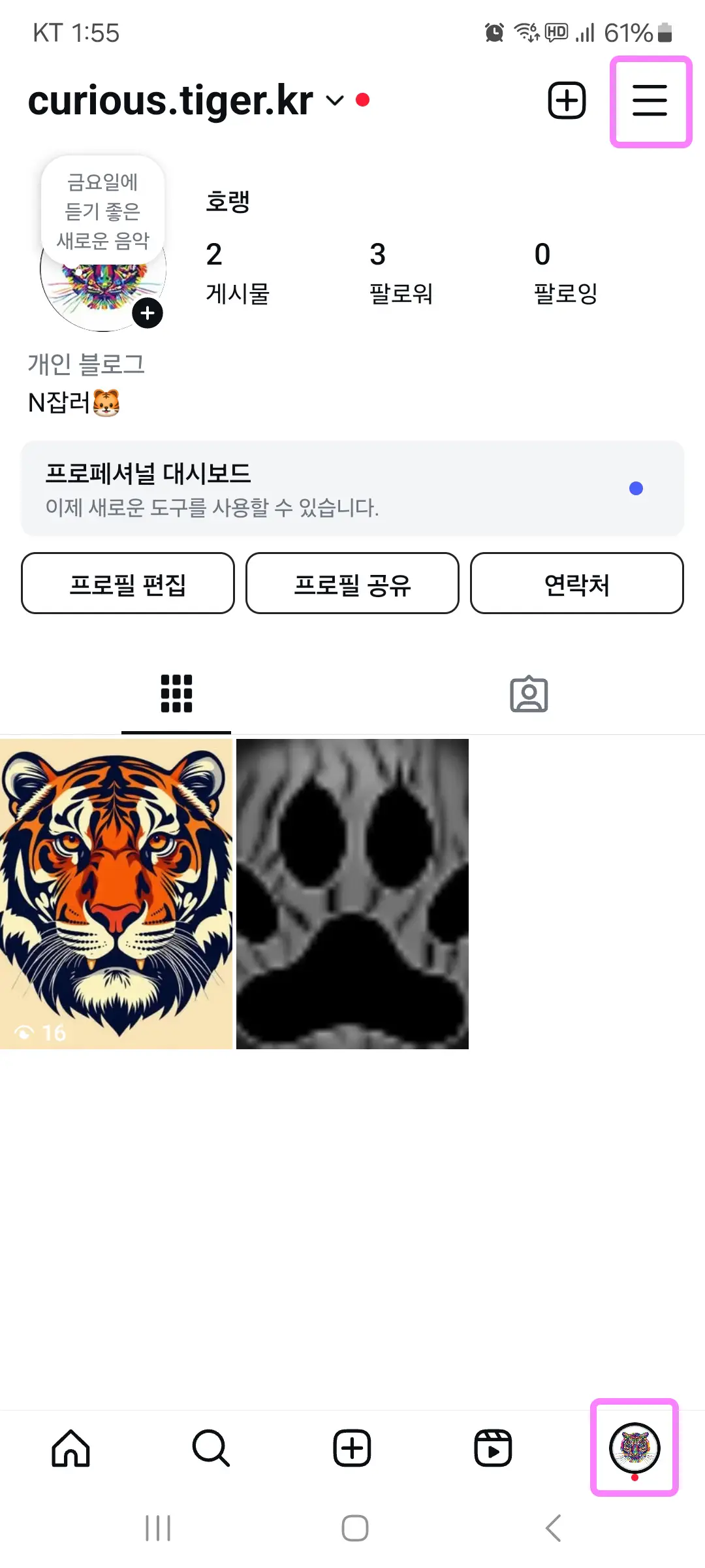 1. 프로필 아이콘을 누른 다음 더보기(세줄 아이콘) 클릭