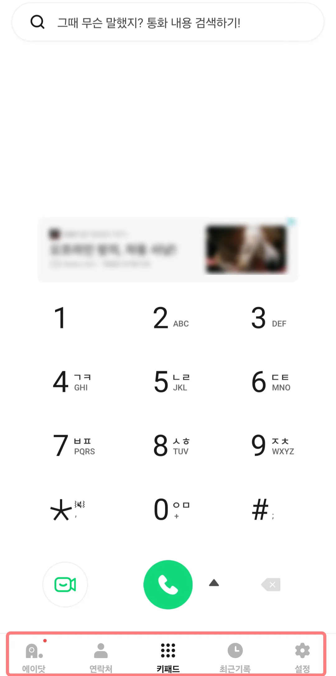 메뉴는 크게 에이닷 탭, 연락처, 키패드, 최근 기록, 설정으로 구성 되어 있어서 티전화와 별반 달라지지 않았다.